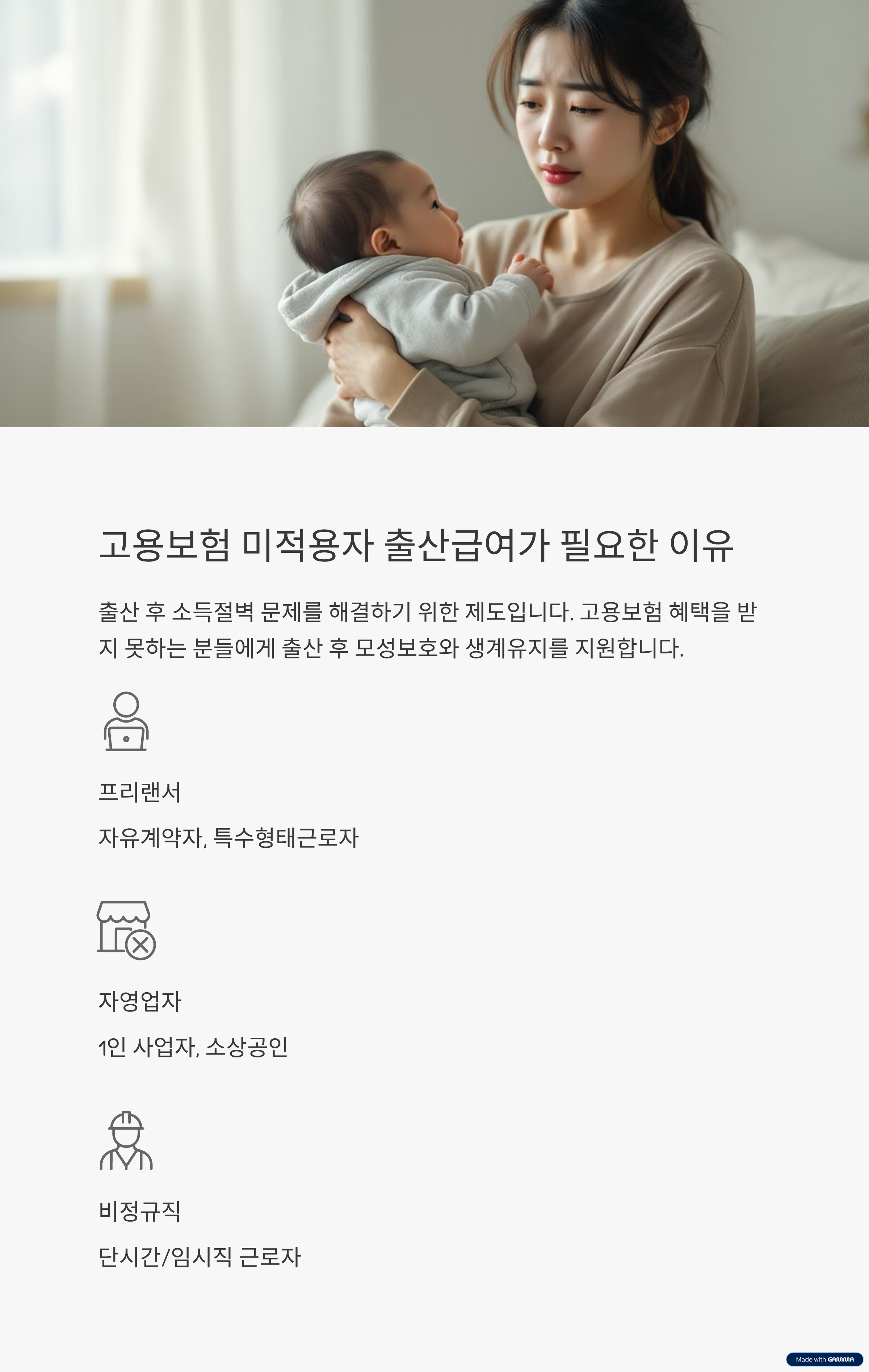 고용보험 미적용자 출산급여는 프리랜서, 자영업자, 특수고용직, 임시직 등 더 이상 사각지대에 머물지 않아도 되는 제도입니다.