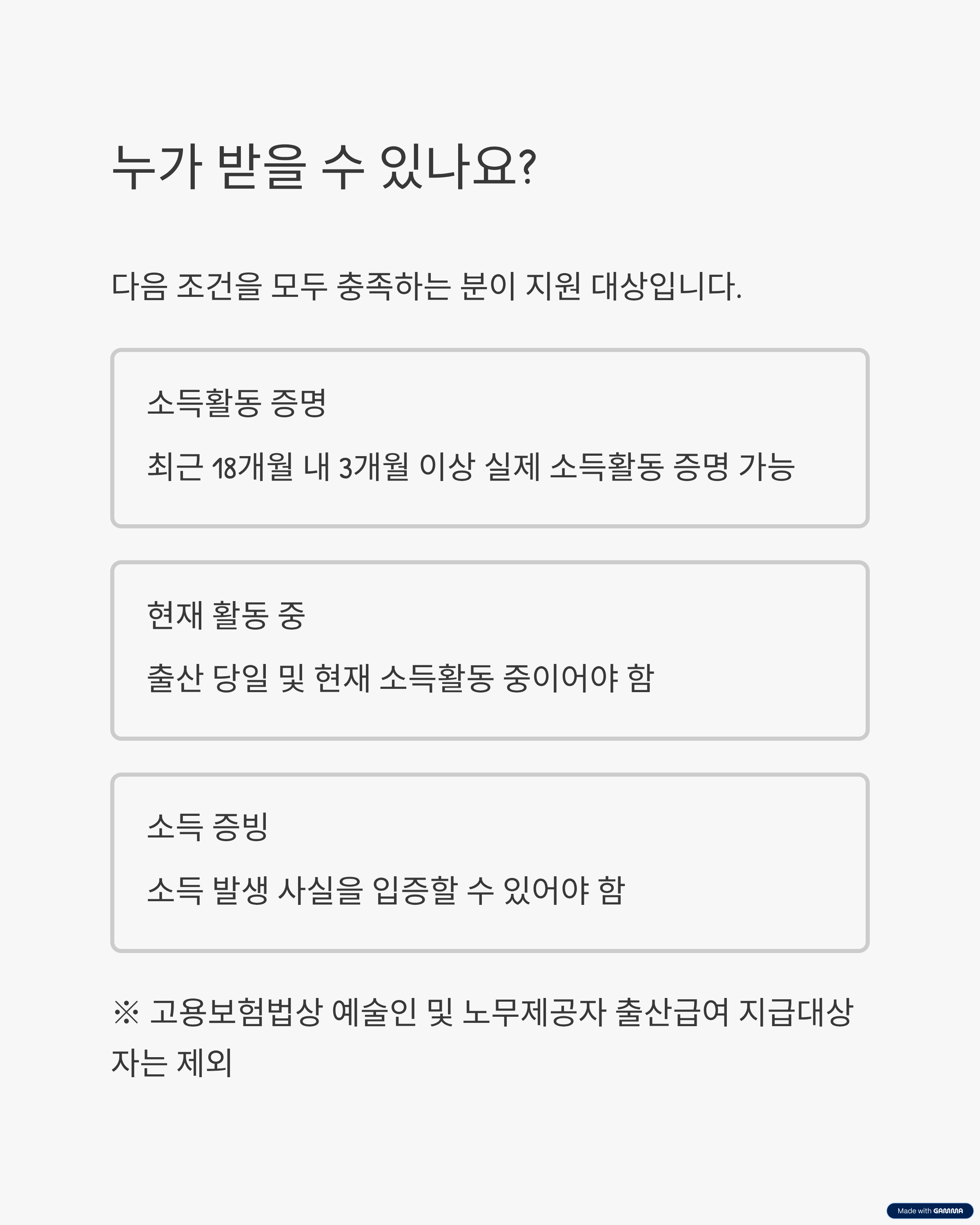 - 출산 당일 및 현재 소득활동 중이어야 하며, 소득 발생 사실 입증