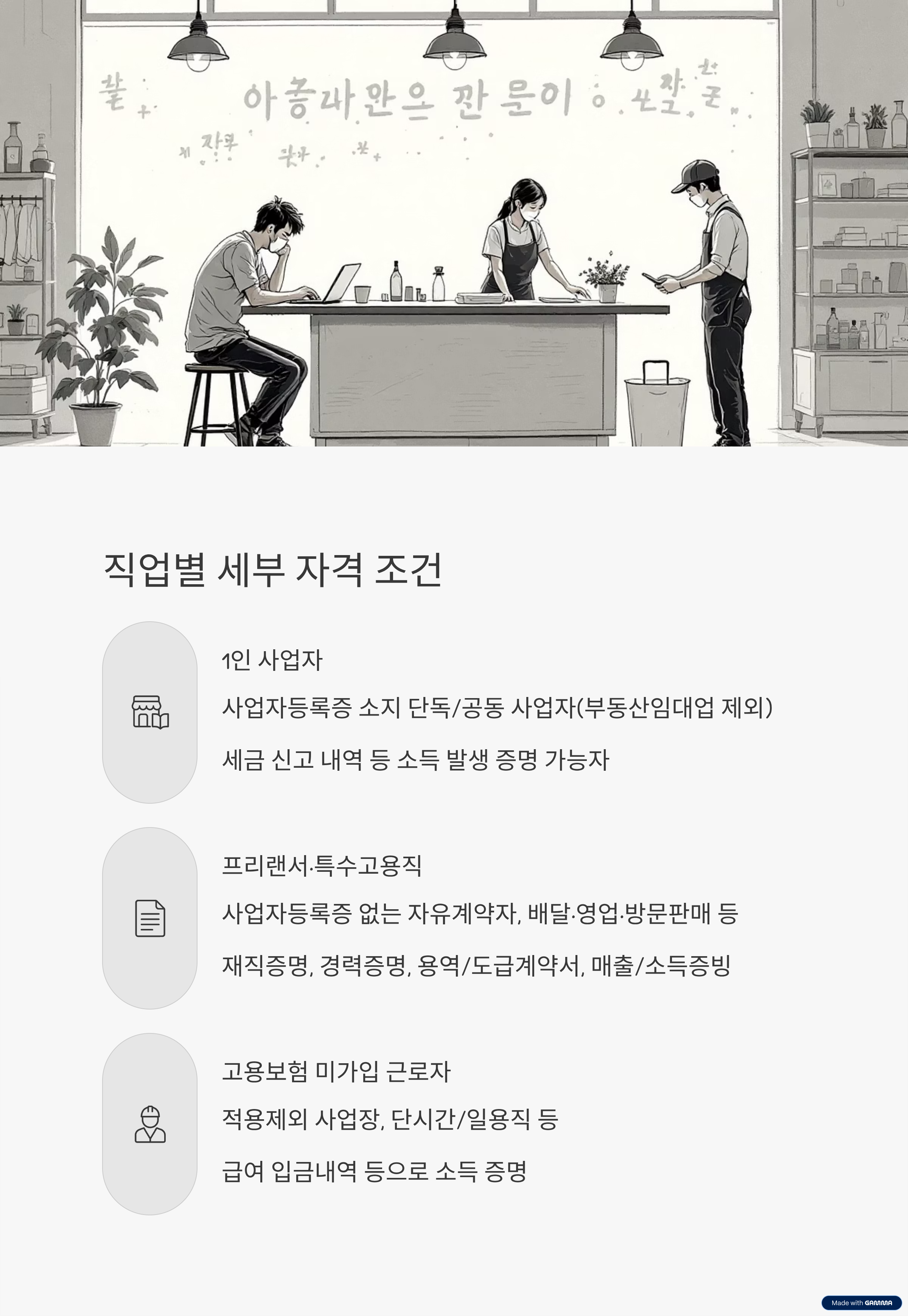 - 근로자, 1인 사업자, 프리랜서·특수고용직 모두 가능