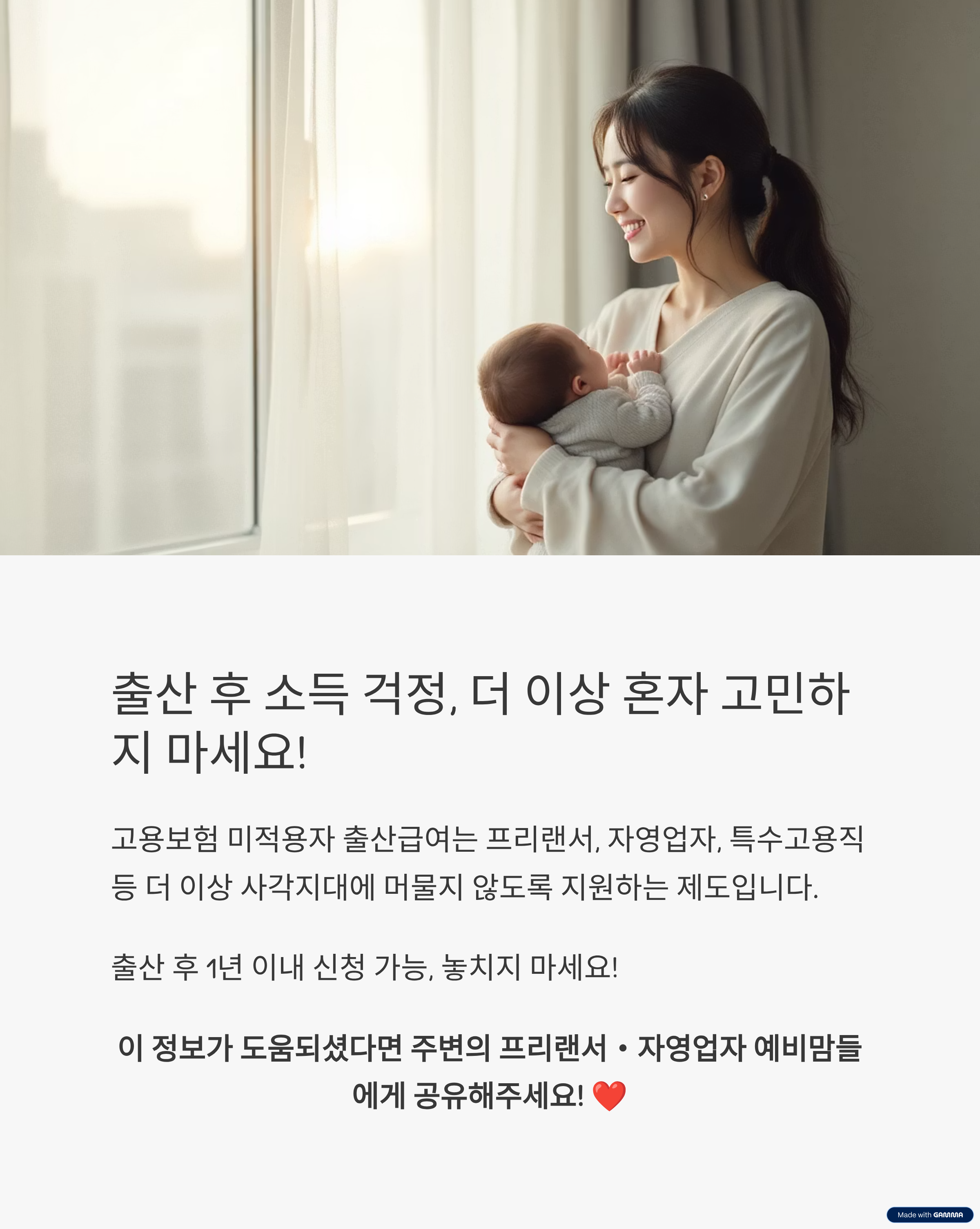 이런 고민을 가진 분들을 위해 2025년 기준, 고용노동부와 보건복지부가 제공하는 '고용보험 미적용자 출산급여' 지원 제도를 안내해드릴께요.