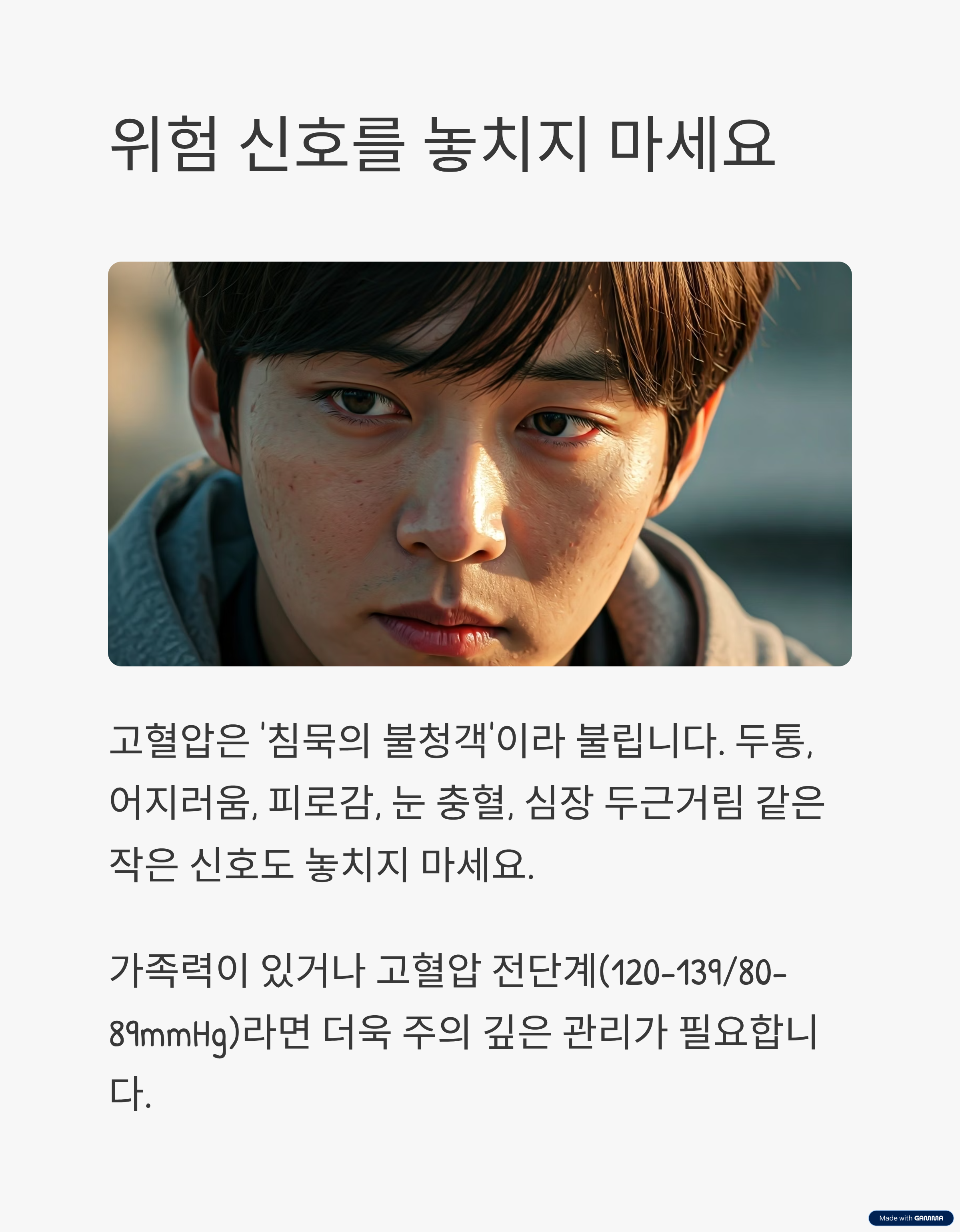- 특히 가족력이 있거나 고혈압 전단계(120~139/80~89mmHg)인 경우 주기적인 관리가 필수입니다.