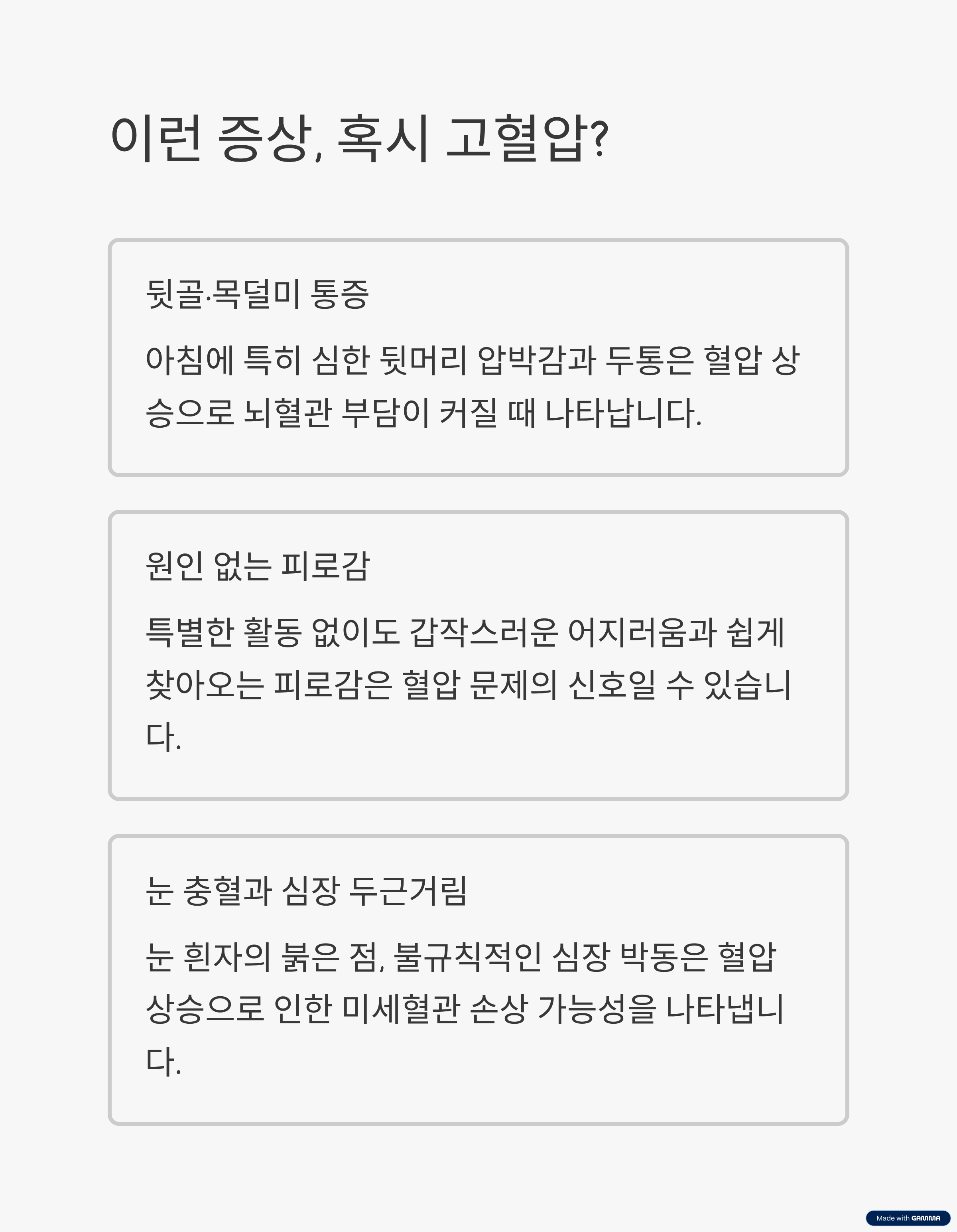 - 많은 고혈압 환자가 가장 먼저 경험하는 증상은 뒷머리, 목덜미에서 느껴지는 ‘압박감, 두통’입니다.
