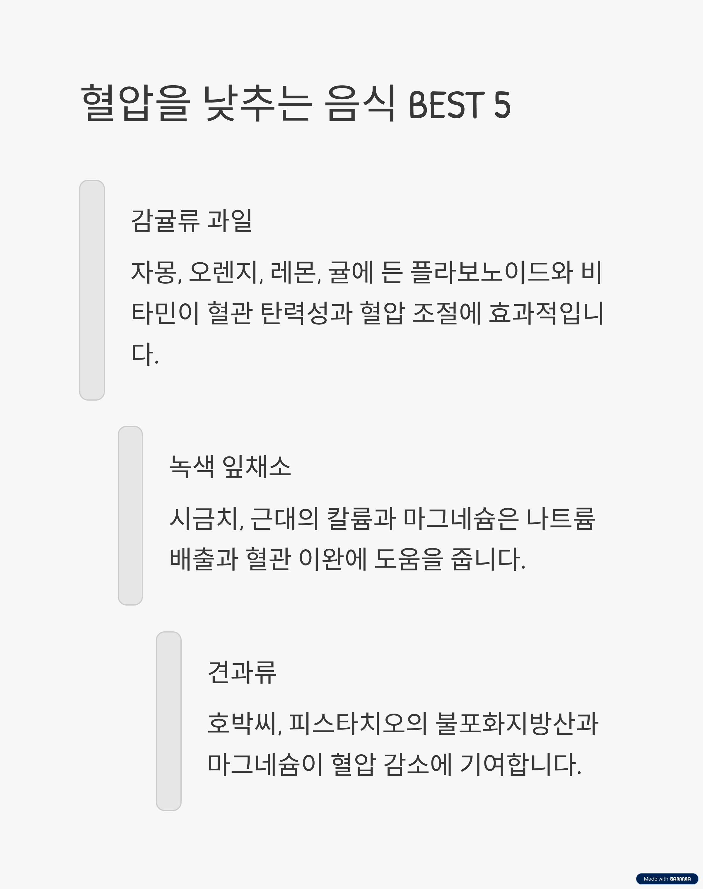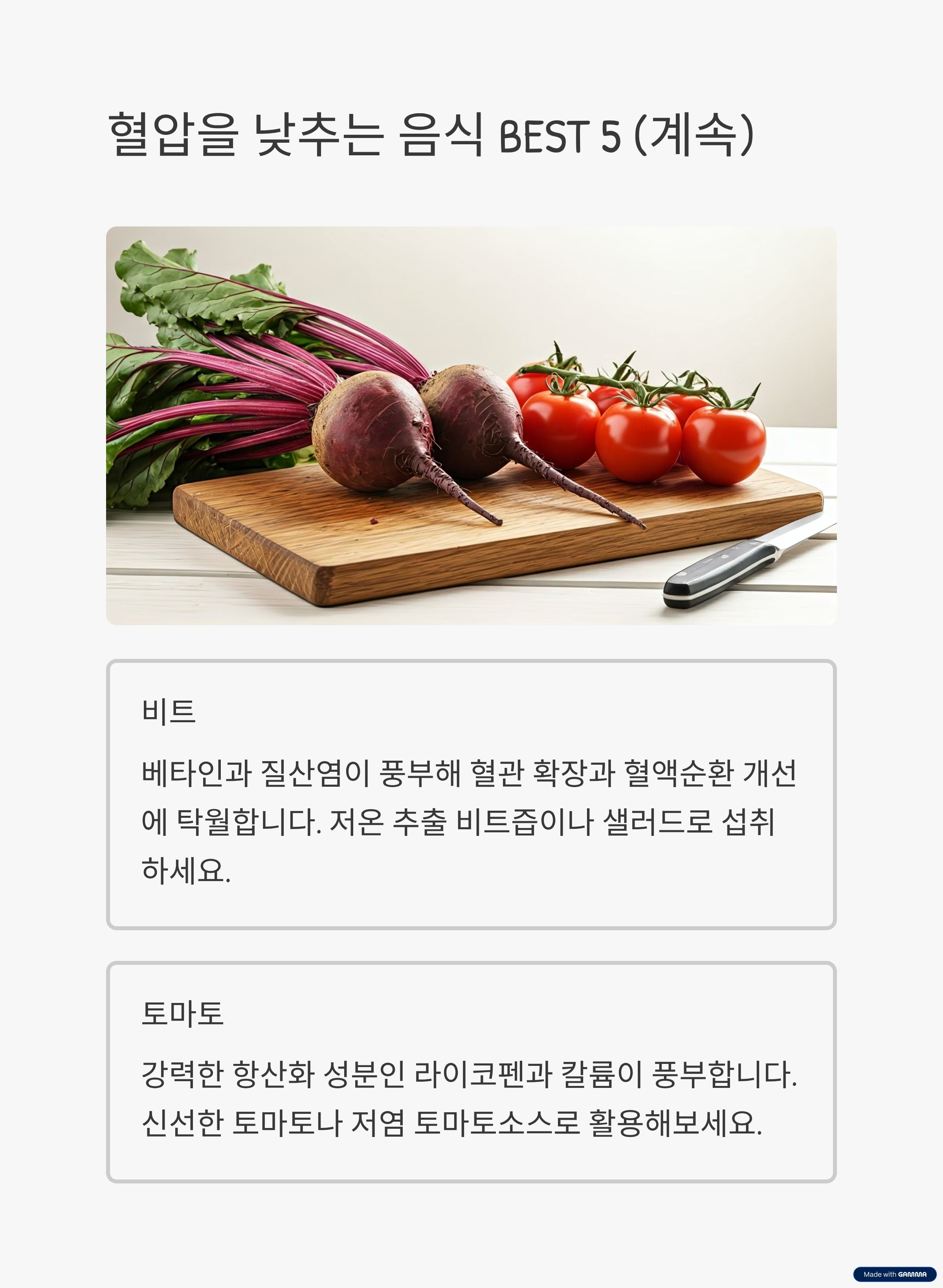 - 앞서 소개한 감귤류, 녹색 잎채소, 씨앗·견과류, 비트, 토마토를 꾸준히 섭취하세요. 이들은 혈관 이완과 나트륨 배출에 중요한 역할을 합니다.