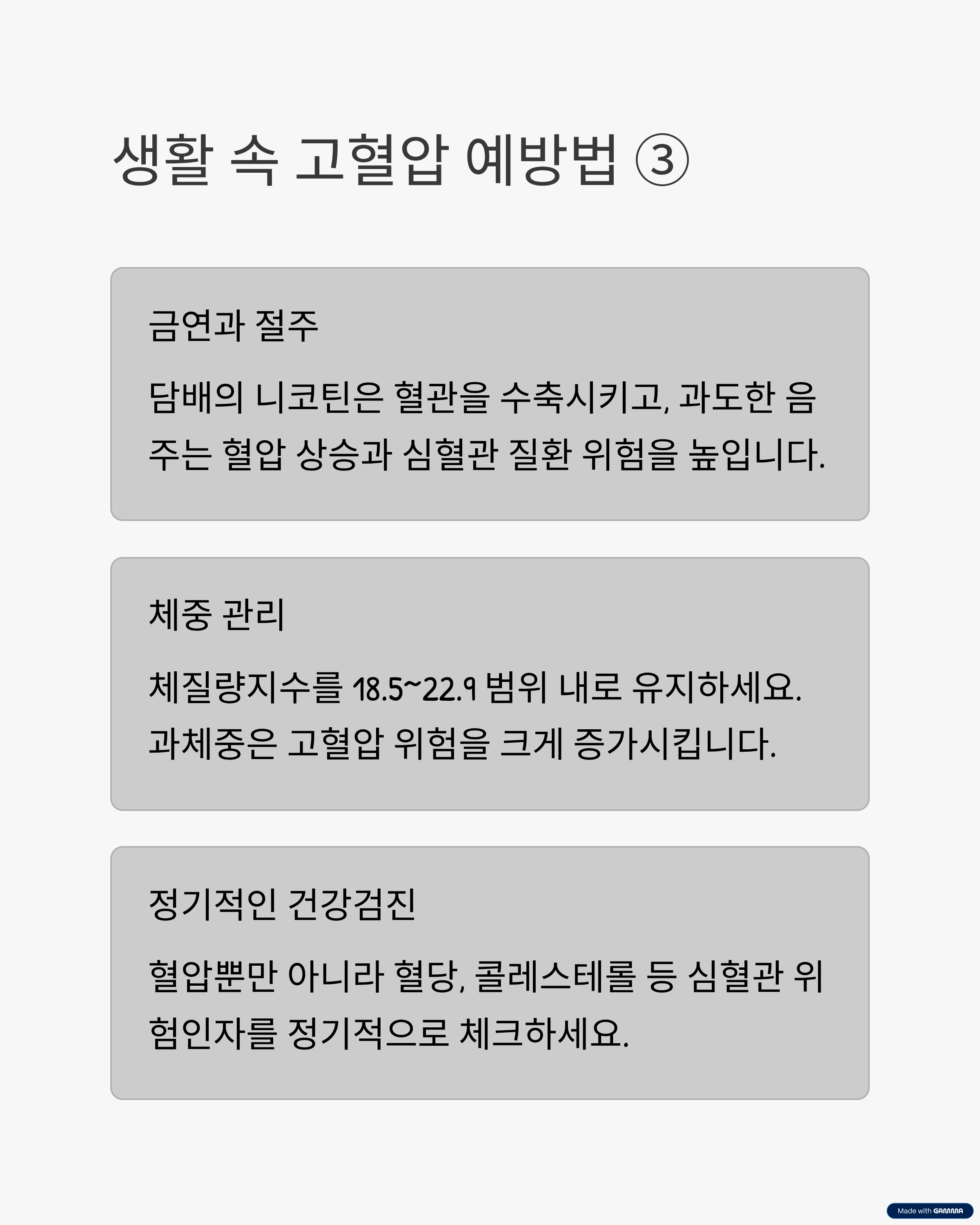 - 체중이 정상 범위(체질량지수 18.5~22.9) 안에 있도록 식사 조절과 운동을 병행하세요. 과체중은 고혈압 위험을 크게 증가시킵니다.