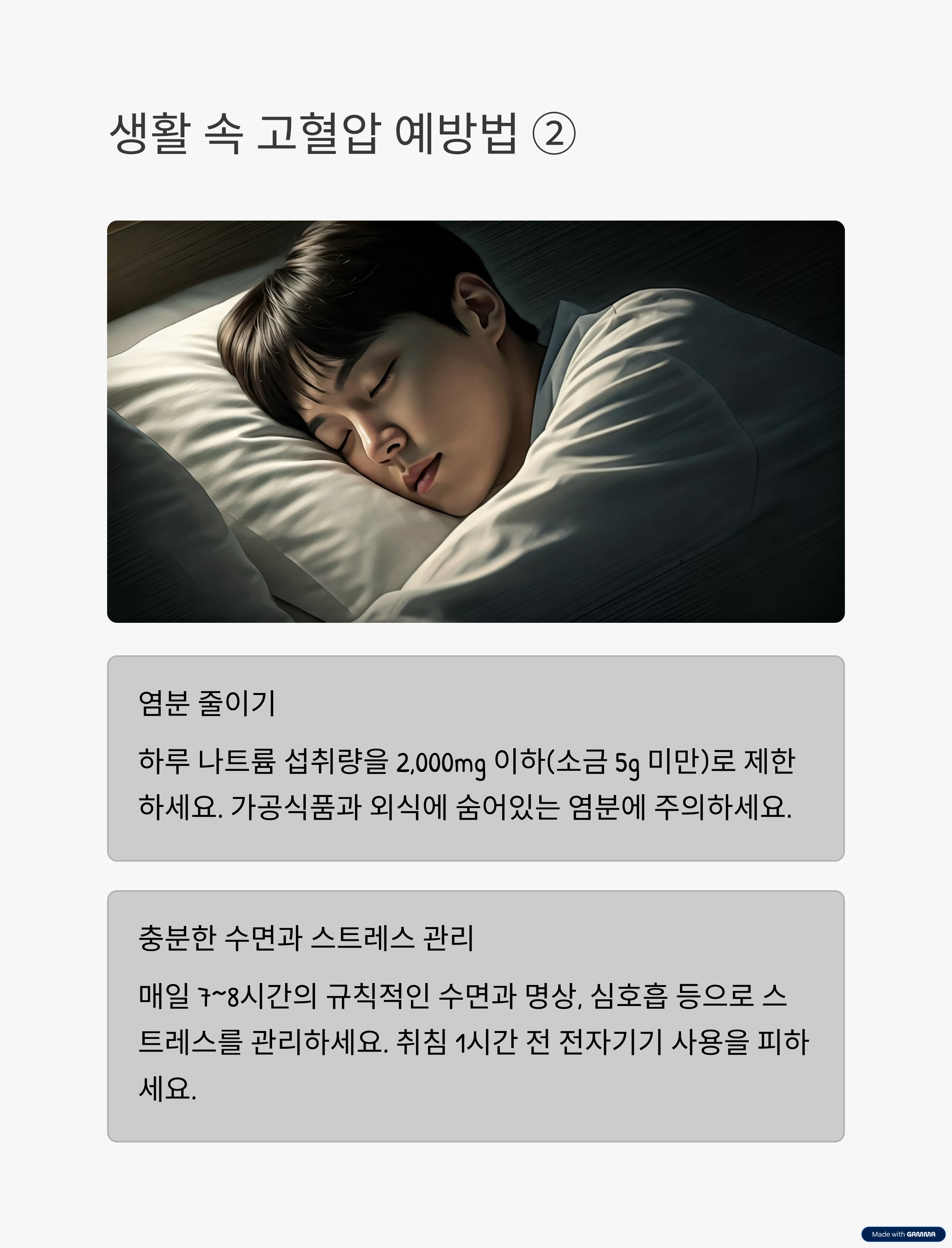 - 매일 7~8시간의 규칙적인 수면은 혈압 안정에 필수 요소입니다.