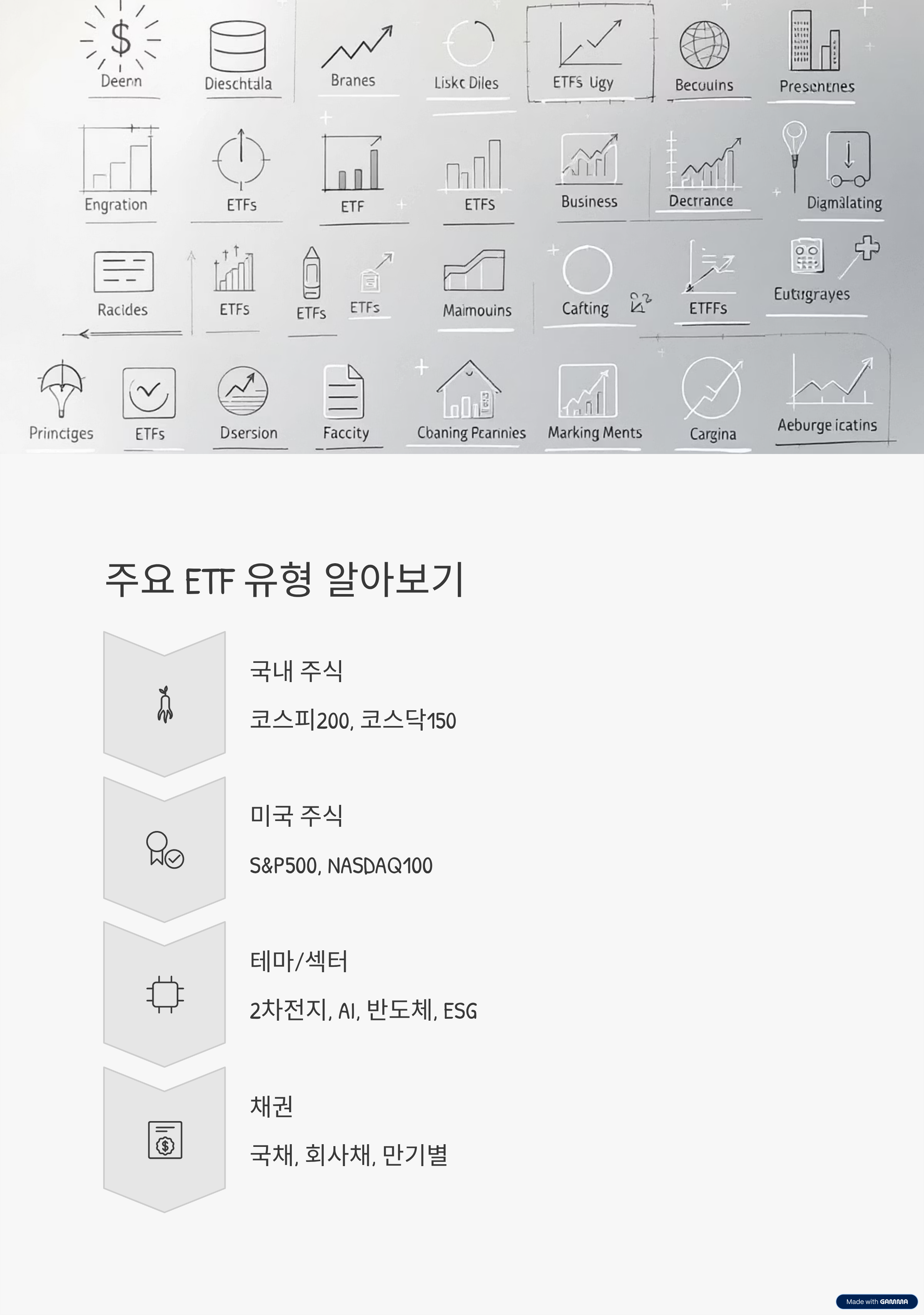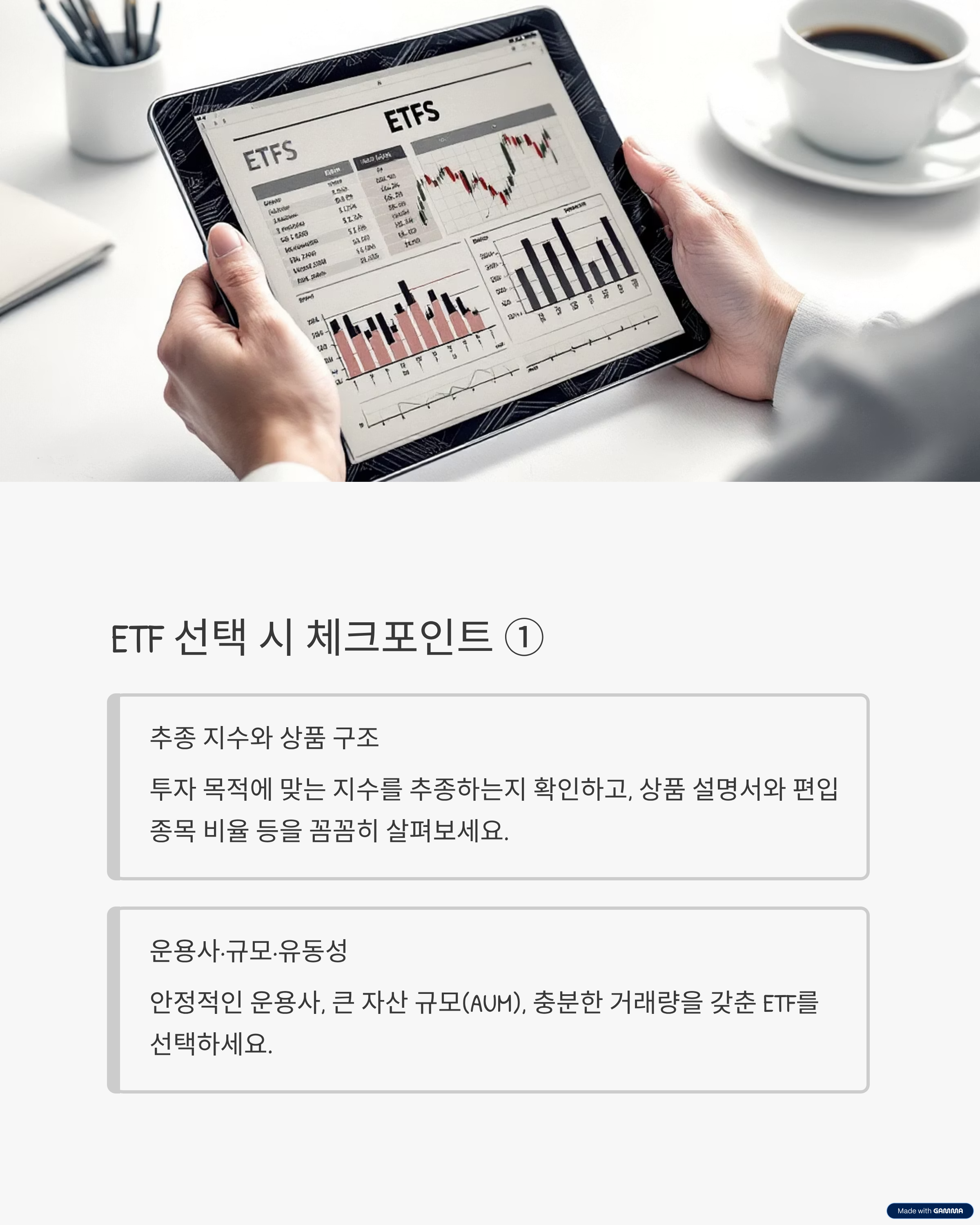 ETF는 운용사가 안정적이고, 상품 규모(AUM)가 크며, 거래량이 충분한 것을 고르세요.