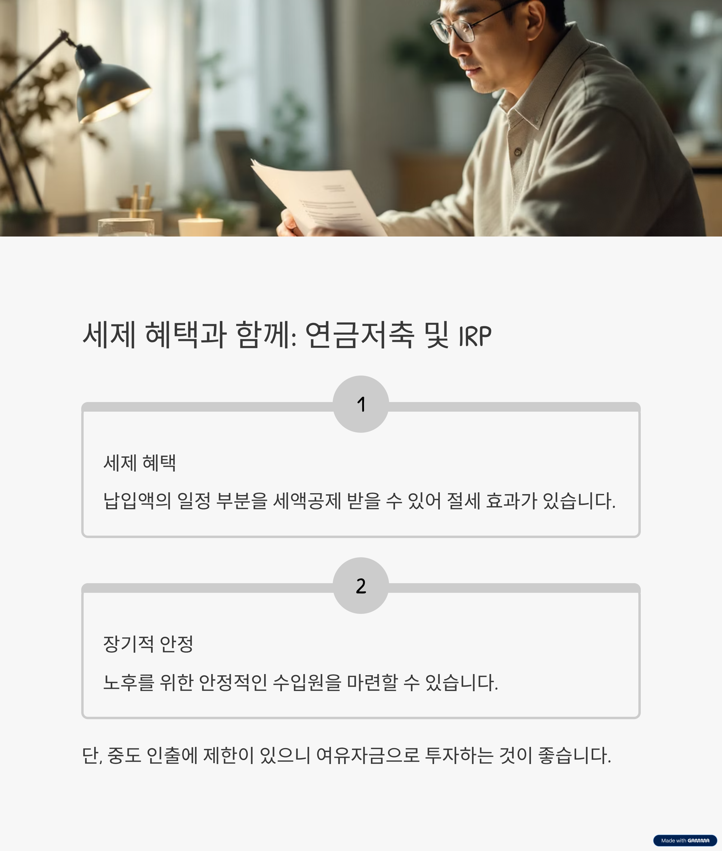 - 단점: 중도 인출 제한, 일정 기간 운용 필요