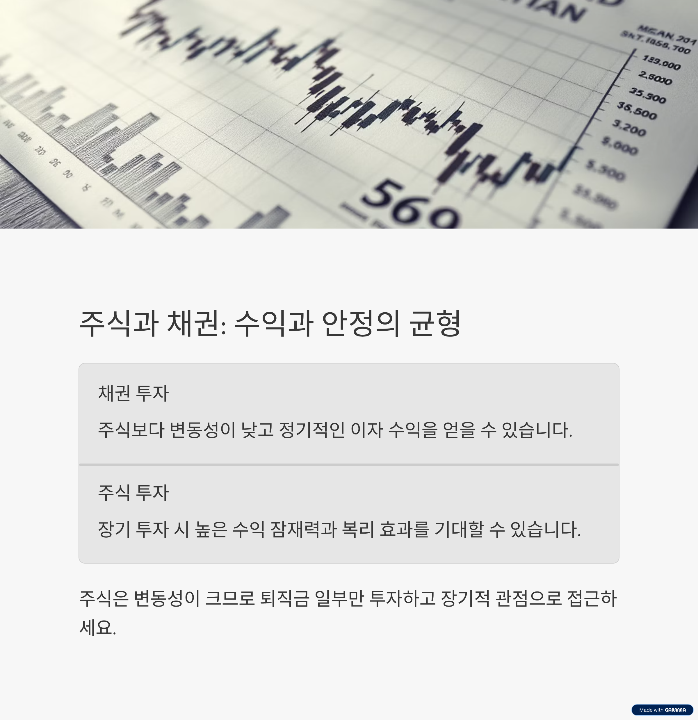 주식 투자는 변동이 크기 때문에 전체 퇴직금 중 일부만 투자해서 위험 분산을 해야 하며, 장기적 시각으로 접근하는 것이 바람직합니다.