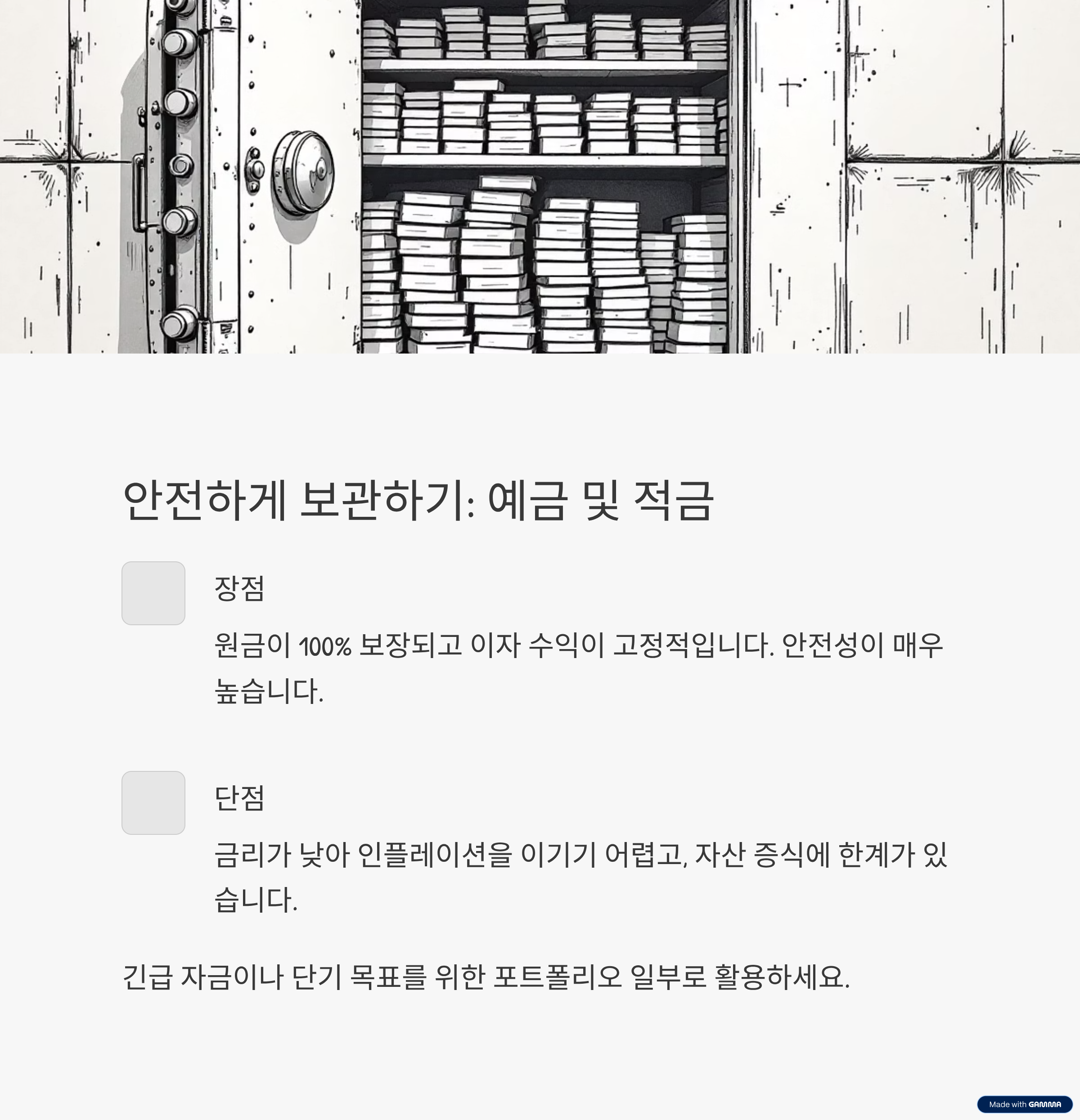- 단점: 금리가 낮아 인플레이션을 감당하기 어려움, 자산 증식 한계
