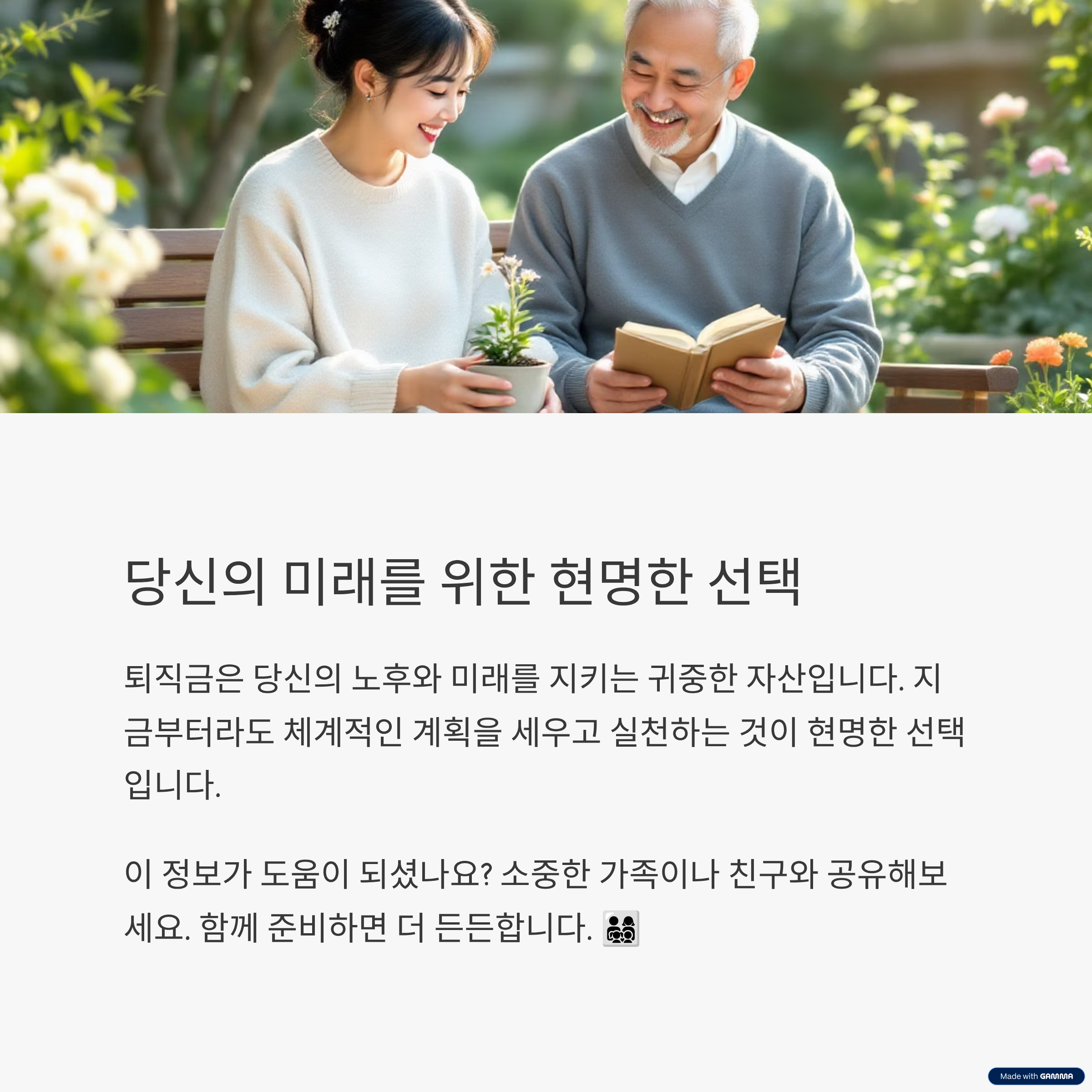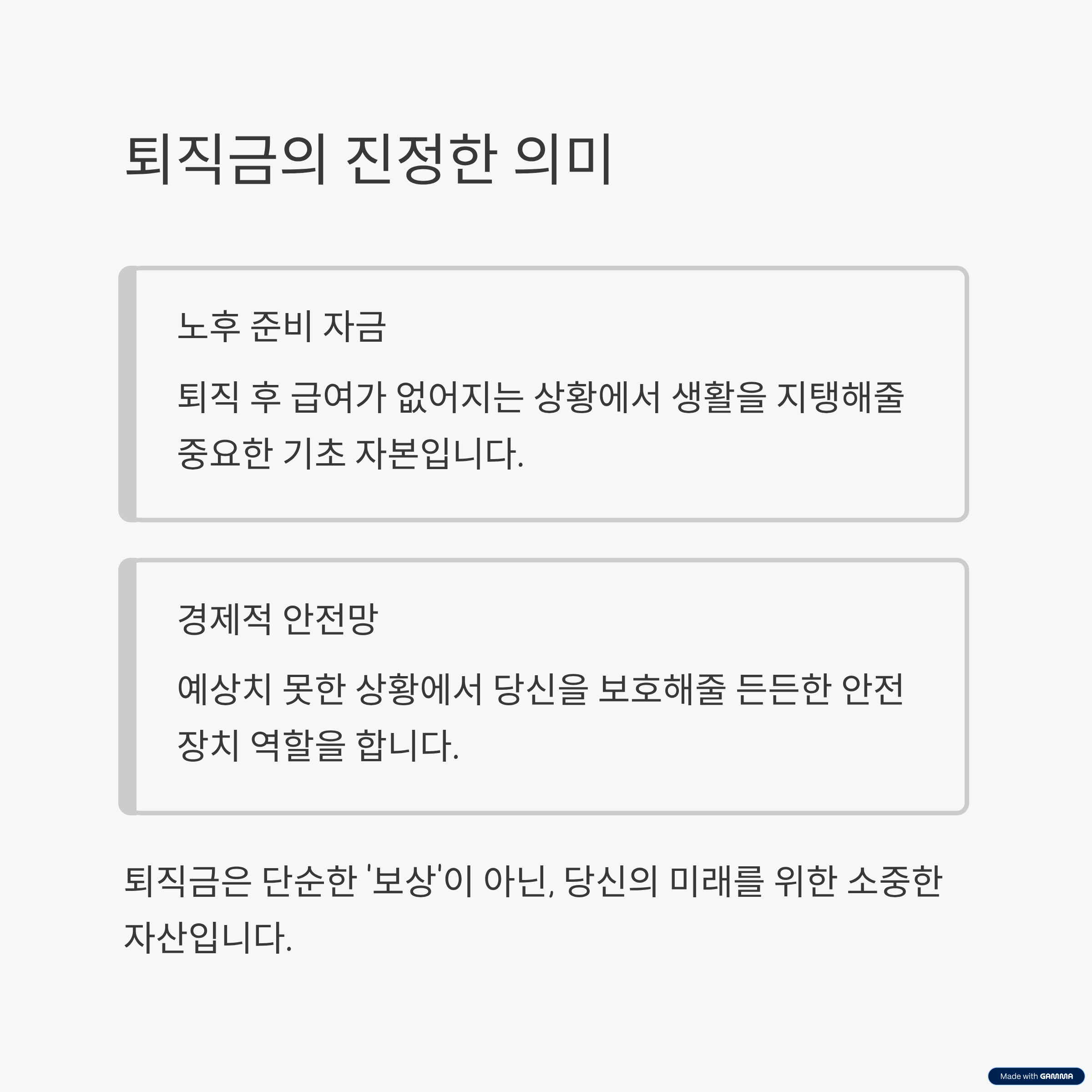 퇴직금은 여러분의 미래를 지키는 귀중한 자산입니다. 올바른 정보와 신중한 운용 전략으로 퇴직 후 안정적인 삶과 경제적 자유를 달성할 수 있습니다. 지금부터라도 체계적으로 계획을 세우고 실천하는 것이 현명한 선택입니다.