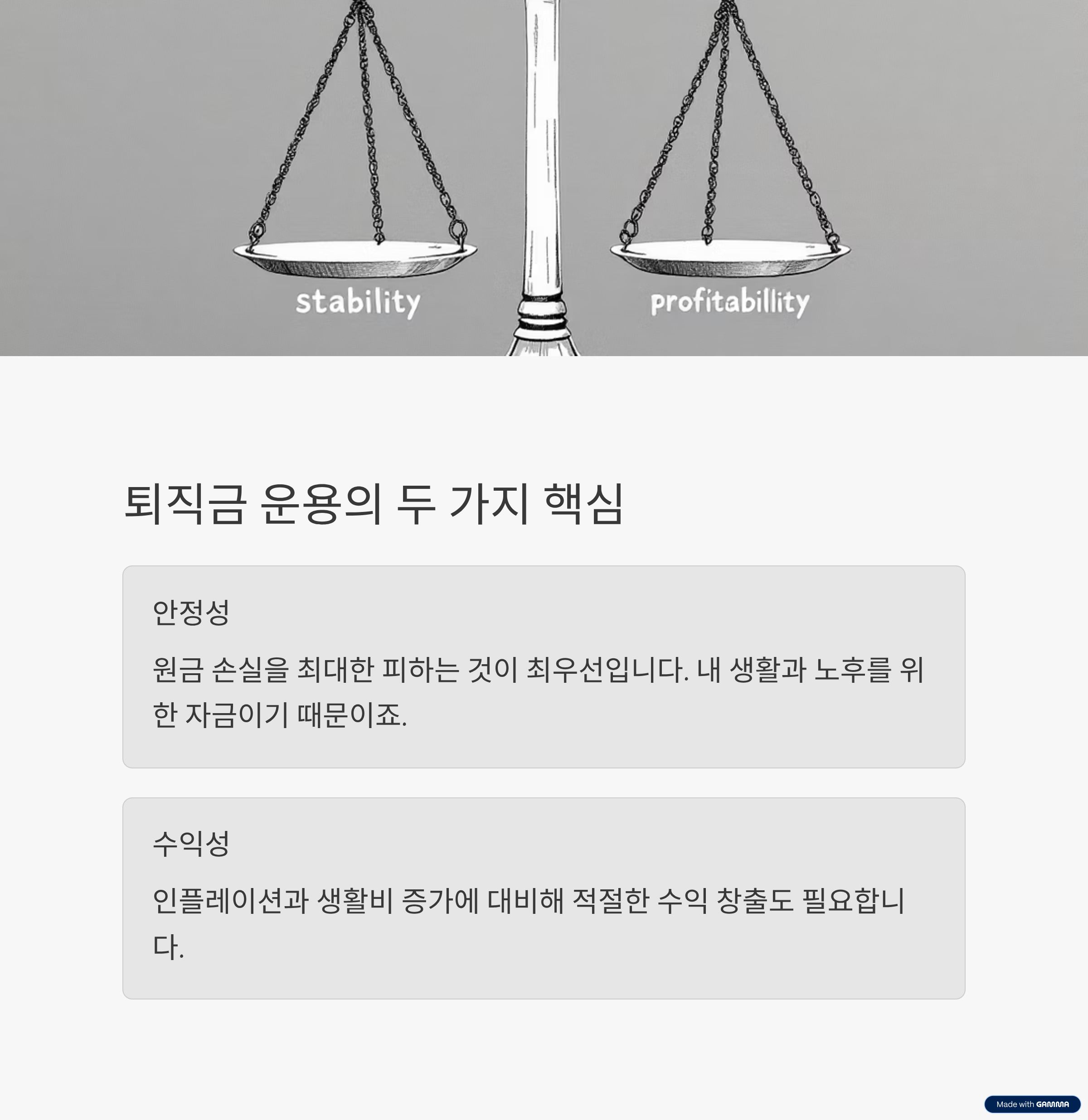 퇴직금은 장기적 관점에서 안정성과 일정 수준의 수익성을 모두 고려해서 운용해야 합니다. 다음은 운용 시 반드시 고민해야 할 두 가지 핵심 기준입니다.