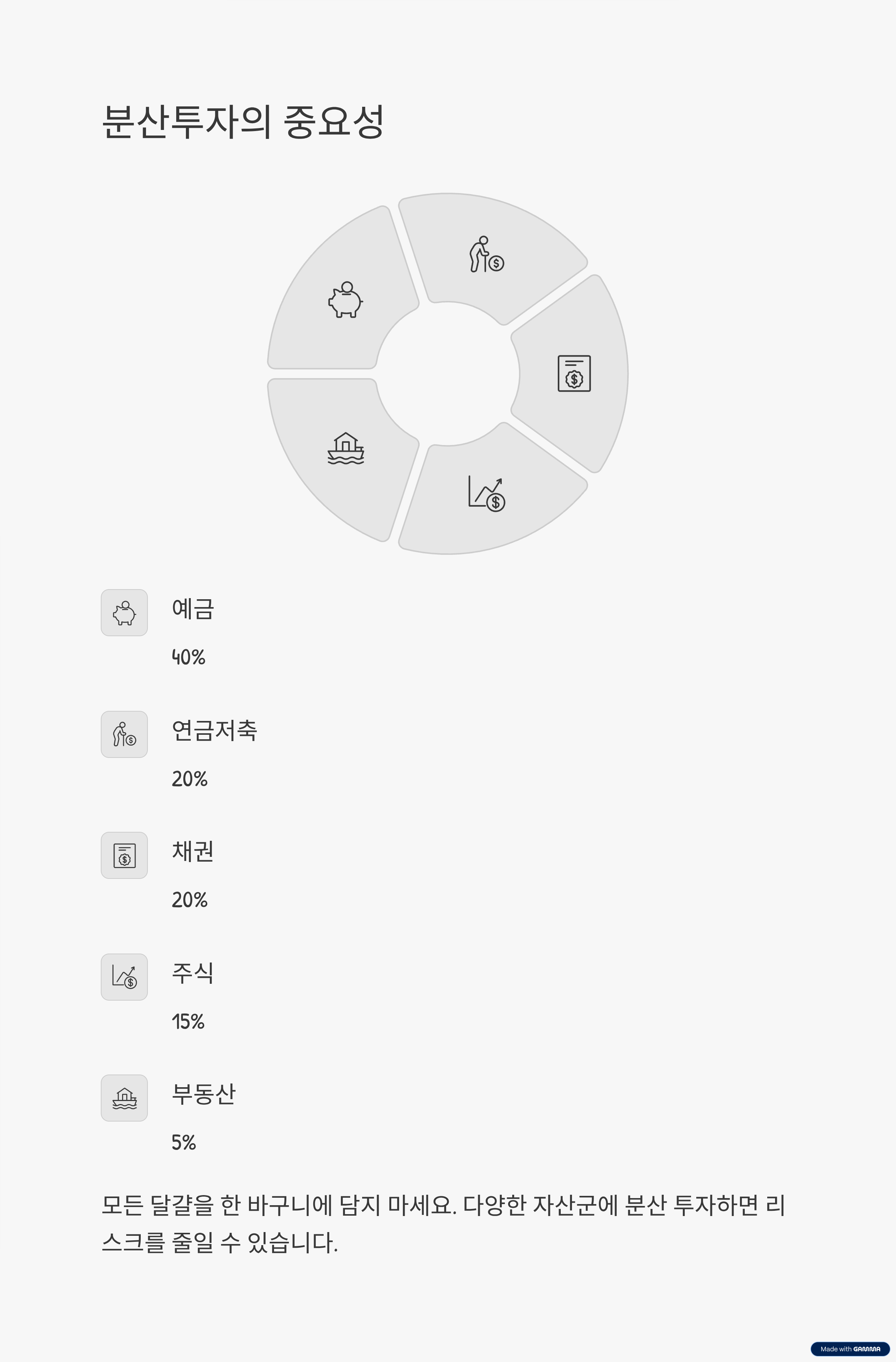 - 예금, 연금, 채권, 주식, 부동산 등 여러 자산에 나누어 배분한다.